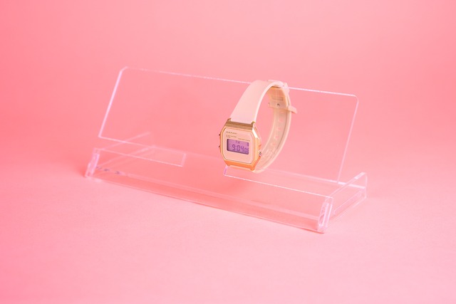 シンプルで使いやすい、オリジナルデザインのアクリル製ウォッチスタンドです。 安価ながらもしっかりとした作りで、複数本の時計を安心してディスプレイできます。 丈夫なアクリル素材が、大切な時計を美しく引き立てながら安定して支えます。 最大4つの時計を同時に飾ることができるワイドタイプで、コレクション展示やショップ用ディスプレイにも最適。 縦100mm × 横220mmのサイズ設計で、存在感がありつつも置き場所を選ばず、デスクや棚をすっきりと演出します。 お気に入りの時計をまとめて、気軽に、そしてスマートに飾りたい方におすすめのスタンドです。