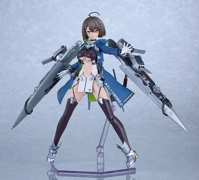 私はボルチモア、通りすがりの重巡洋艦だ……と、冗談はここまでにして…ボルチモア、着任した。 『アズールレーン』より、ボルチモア型重巡洋艦ネームシップ「ボルチモア」が艤装を装備した姿で初プラモデル化! ・全高約160mm、各関節可動。 ・取り外し可能な艤装が付属。フレキシブルに可動するアームによりポーズに合わせて展開し、放射状に広がる特徴的なシルエットを表現可能。 ・胸部と腰衣装の引き出し構造や、コートの可動により自由度の高いポーズ付けが可能。 ・表情パーツは塗装済みの笑顔パーツに加え、デカールにより好みの目線を選択できる2種類が付属。 ・目線を振った水転写アイデカールに加え、艤装とコートの文字部分もデカールで付属。 ・各種交換手首付属。 ・各成形色、彩色済みパーツにより、組み立てるだけでイメージに近い色分けで再現。 ・可動支柱付き台座付属。