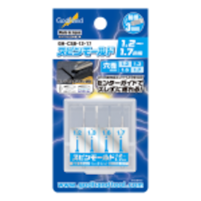 下穴不要!丸モールドを簡単に掘ることができる平型ドリルの微妙なサイズ違い4本セット! ピンバイスに固定して使用する、センターガイド付きのフラットドリルビットです。 一般的なドリル刃と異なり、底が平らな穴を掘ることができます。 センターガイドを活用することで、より正確な位置に、きれいな丸穴を掘ることができます。 1.2mm、1.3mm、1.6mm、1.7mmの4本セット 軸の太さはΦ3mmに統一されているので、ピンバイスのコレットチャックを差し替えずに交換できます 保管、持ち運びに便利なケース付 ●品質表記 ▼1.2mm~1.7mm(4本セット) セット内容:1.2mm/1.3mm/1.6mm/1.7mm ⚠注意事項 ・ピンバイスにしっかりと固定してからお使いください ・センターガイドにより、中心に小さな穴があきます ・別売「スピンブレード」のように彫刻刀として使用することはできません ・周りに人がいないことを確認し、安全のため保護メガネをご着用ください ・切削物や、破損した刃が目に入った場合、失明などの恐れがあります ・硬度の高い金属を使用して製造していますが無理な力を加えたり、こじるように使用すると刃先が破損し思わぬケガをする場合があります ・使用後は乾いた布で拭き取り油を塗布してケースに収めてください ・刃物なのでケガには十分にご注意ください ・能力以上の負荷をかけないでください ・必ず右回転でゆっくりと掘り進めてください