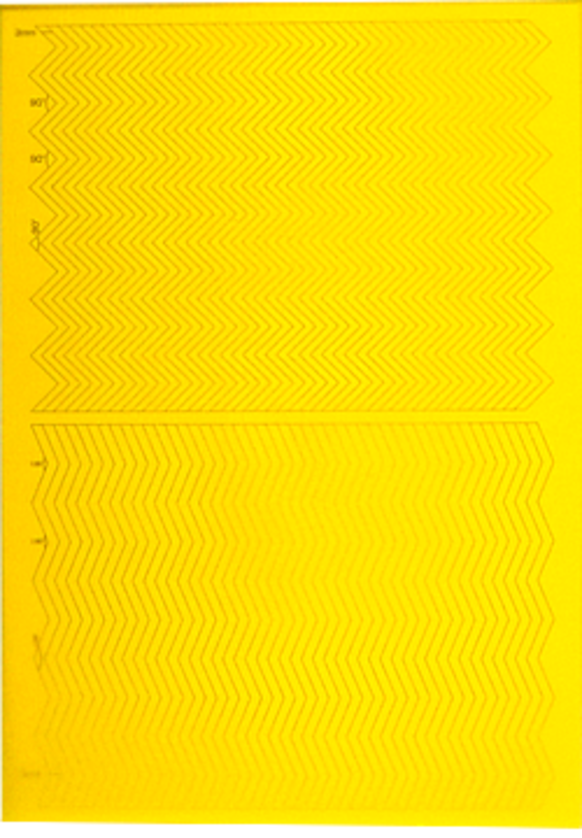 山型のデザインをした3mm幅のマスキングシートです。山型は90°と135°のわかりやすい2種類の角度で様々な角度に対応します。台紙から剥がす際にはピンセットをご使用ください。付着面に「油分」や「プラスチックかす」などがあるときれいに貼れない可能性がありますので、付着面をきれいにしてから使用してください。 内容量:A5サイズ 1枚入