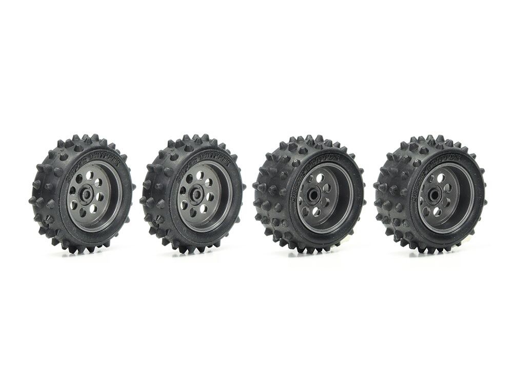 【 少ないパーツ数で組み立てやすいEZシャーシ 】 シャーシはパーツをはめ込むだけで手軽に組み立てられ、単3形電池1本で走るEZ(イーゼット)。前後にそれぞれギヤを重ね、その上からダブルシャフトモーターを置いて、カバーをパチッとはめれば駆動系はほぼ完成。しかも、シャーシは動きのメカニズムがよくわかる半透明のスモークカラー。メタリックグレイの5本スポークホイールには高いグリップ力が特長のオフロードタイヤを取り付けます。さらに、ギヤ比は50:1だから、スピードは歩くくらいの速さでも、力強い走りで急な坂道もぐんぐん登ります。