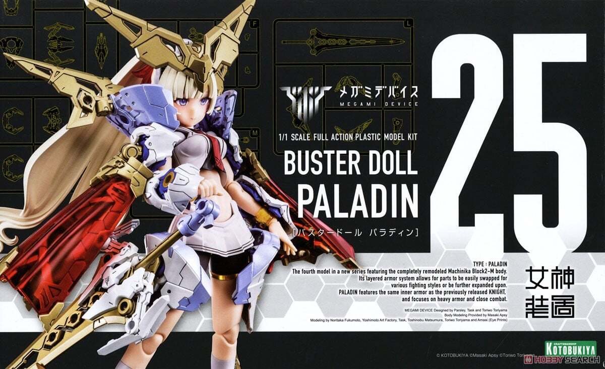 その新素体に合わせてデザイン設計されたBUSTER DOLL パラディンはコンセプトデザインをメガミデバイスプロデューサーの鳥山とりを氏が担当、メカニックデザインを設計担当のたすく氏自らが行っているため、従来のメガミデバイスキットに比べよりシステマチックに組み立て、カスタムが楽しめるよう工夫されています。