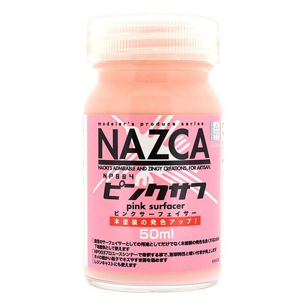 薄いピンク色のサーフェイサーです。サーフェイサーとして下地を整え、ピンクの下地の効果によって上塗りの塗料の発色を良くします。メタリックなどより赤や青などのソリッドカラーに効果的です。サーフェイサーとしての目の粗さは1,000番~1,200番くらいとなります。