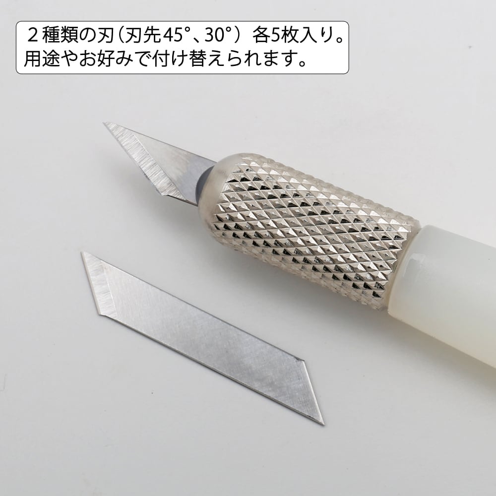 軸が握りやすい六角タイプのデザインナイフ。耐薬品性に優れた樹脂ホルダー。切り絵や消しゴムはんこに最適。2種類の刃(刃先45°、30°)各5枚入。