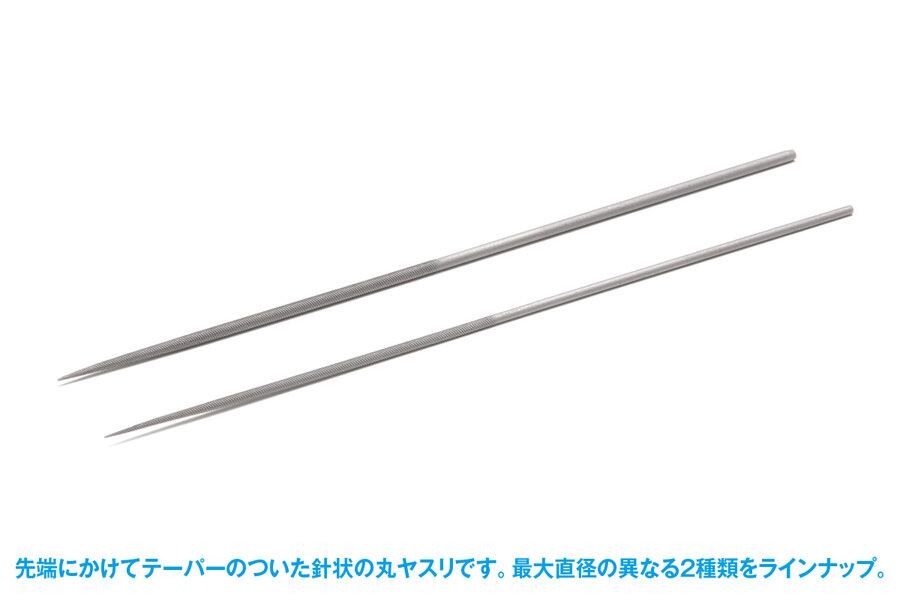 先端にかけてテーパーのついた針状の丸ヤスリで、極小の丸穴の整形や小サイズフィギュアの髪、服のしわなどの加工に便利です。