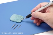細工用ナイフの替刃の他にへらビットが6種類付属。パテや粘土へのモールド付けや、マスキングテープやラベルシールなどの圧着作業に便利です。