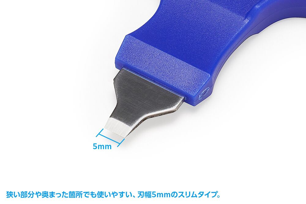 刃先はパーツ同士のすき間に入れやすいように薄く仕上げてあります。また、形状は狭い部分や奥まった箇所でも使いやすい、刃幅5mmのスリムタイプ。