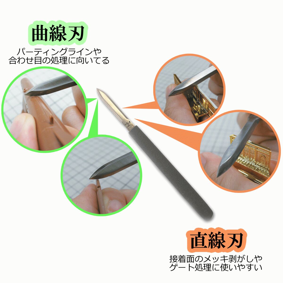 発売して大好評だった「きさげカッター」の刃部分を笹の葉型にしたことによりパーティングラインや合わせ目をピンポイントで切削が可能です。さらに持ち手からのびた直線刃により切削角度に合わせやすくなり、ゲート処理や接着面のメッキ剥がしにも最適です。