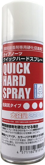 瞬間クリアパテ、瞬間カラーパテの場合、厚塗りしないように盛りつけた上からスプレーすると硬化します。引けが気になる場合は先にスプレーした上から瞬間クリアパテ、カラーパテを塗布します。