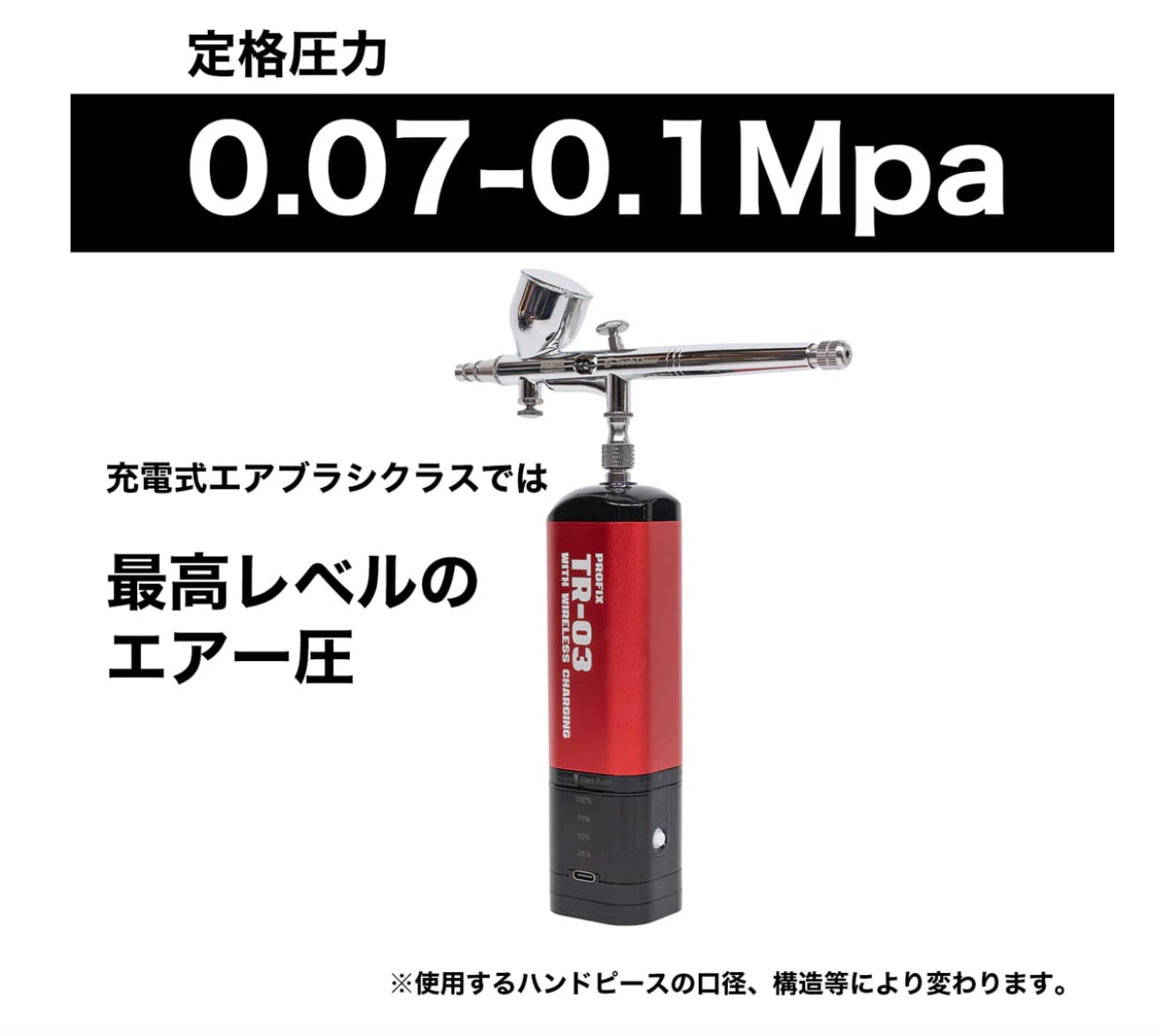コンプレッサーは最大圧力は0.14MPa、定格圧力は0.07〜0.1MPaと、下地塗装から細吹きまで幅広い表現に対応可能な出力バランスを維持。
