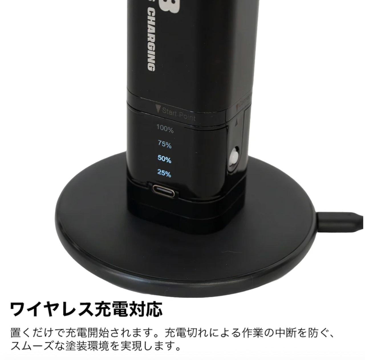 ケーブルを接続する手間が不要になり、充電切れによる作業の中断を防ぐ、スムーズな塗装環境を実現します。