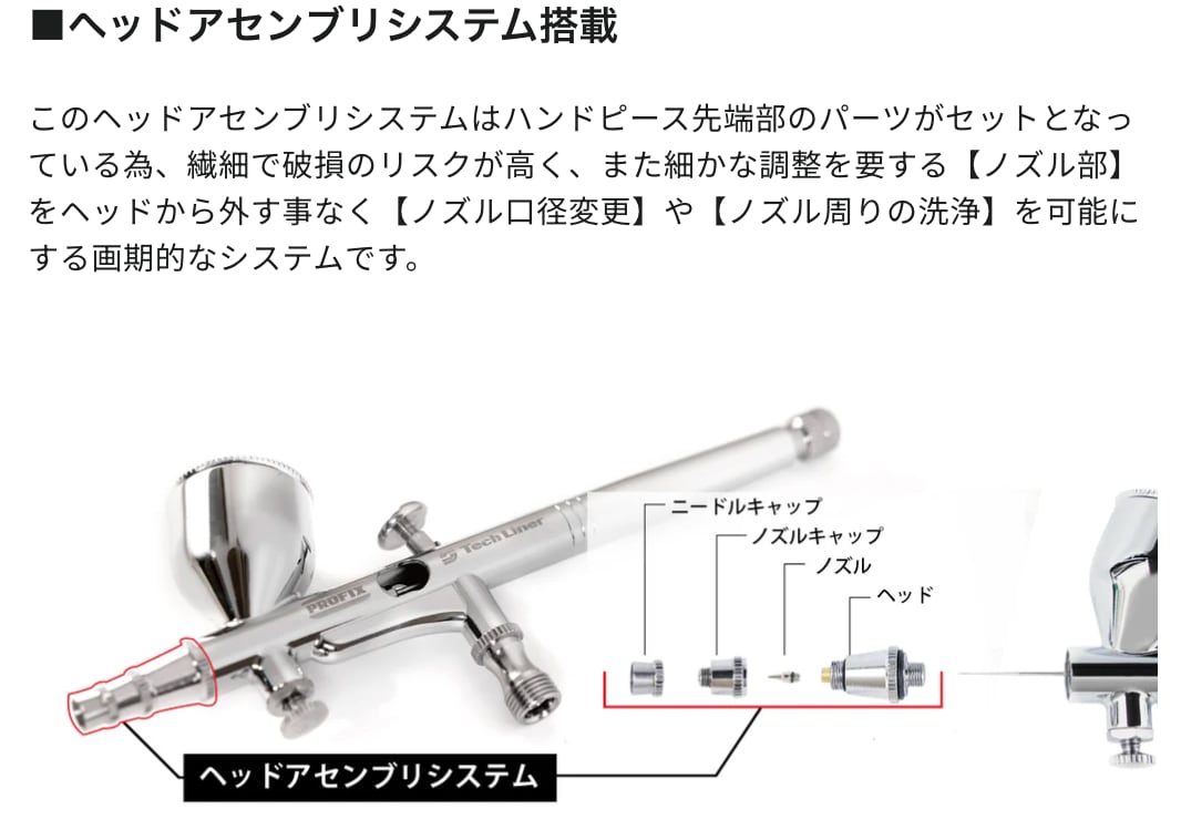 このヘッドアセンブリシステムはハンドピース先端部のパーツがセットとなっている為、繊細で破損のリスクが高く、また細かな調整を要する【ノズル部】をヘッドから外す事なく【ノズル口径変更】や【ノズル周りの洗浄】を可能にする画期的なシステムです。