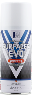 サーフェイサーエヴォホワイトの缶スプレータイプです。下地を整えるサーフェイサーのホワイトカラー。1,000番から1,200番くらいの細かさです。
