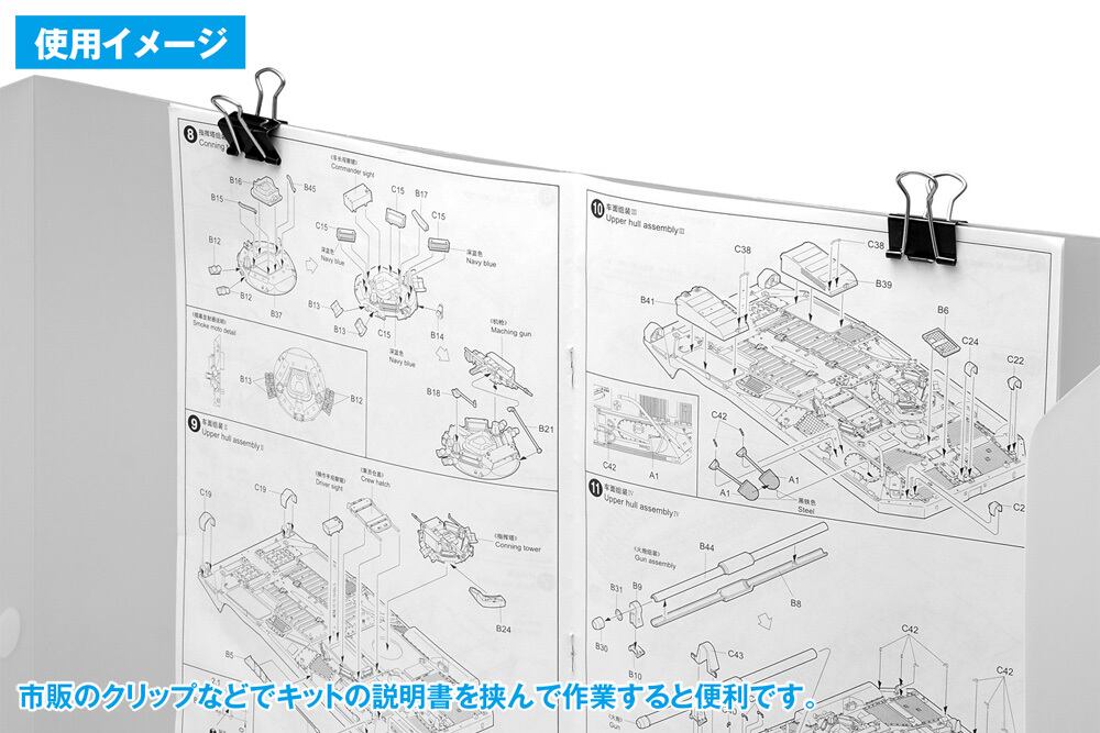 側面に2種類のフックを加工。キットの組立時、使用頻度の高いランナーなどを吊り下げたり、シールをはさんで置いたりすることが出来ます。また、マスクなどの軽いものを吊り下げておくのにも便利です。