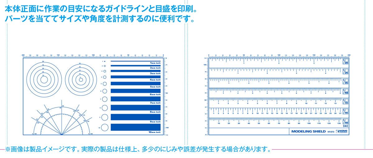 本体正面に作業の目安になるガイドラインと目盛を印刷。パーツを当ててサイズや角度を計測するのに便利です。