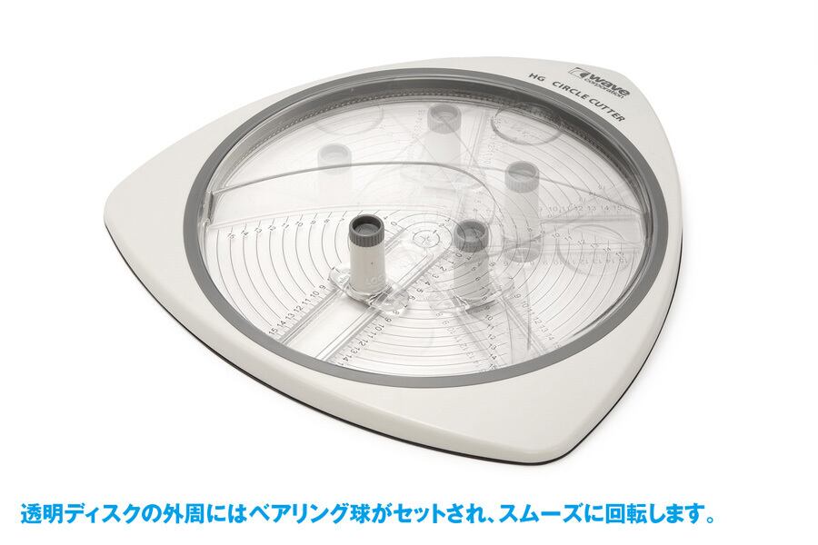 ・カッターヘッドがセットされた透明ディスクを回転させて、円を切り抜くサークルカッター。