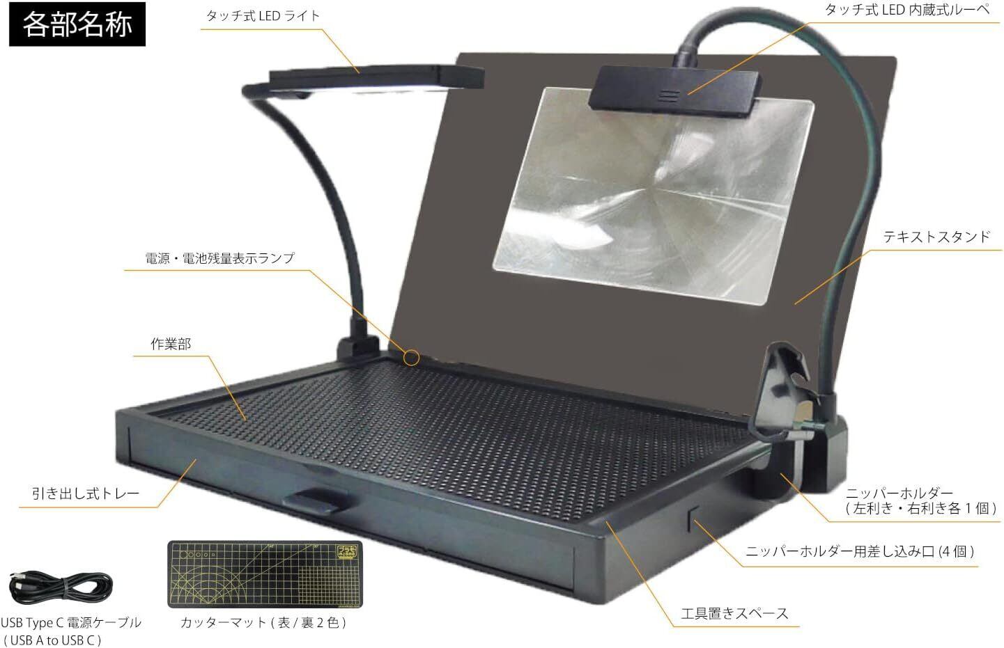 【ワークステーション Ver2.0 Pro】にはLEDライトやLEDライト内蔵のフレームレスルーペ、それらの電源用バッテリーや接続端子が内蔵されています。