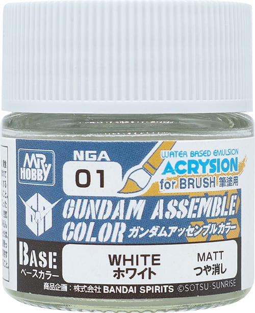 ガンダムアッセンブルカラーのベースカラーは、水系塗料「アクリジョン ベースカラー」シリーズを元に、塗料の伸び、隠ぺい力を筆塗りで楽しむミニチュア用にチューンナップしております。