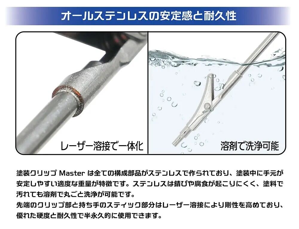 塗装クリップMasterは全ての構成部品がステンレスで作られており、塗装中に手元が安定しやすい適度な重量が特徴です。ステンレスは錆びや腐食が起こりにくく、塗料で汚れても溶剤で丸ごと洗浄が可能です。先端のクリップ部と持ち手のスティック部分はレーザー溶接により剛性を高めており、優れた硬度と耐久性で半永久的に使用できます。