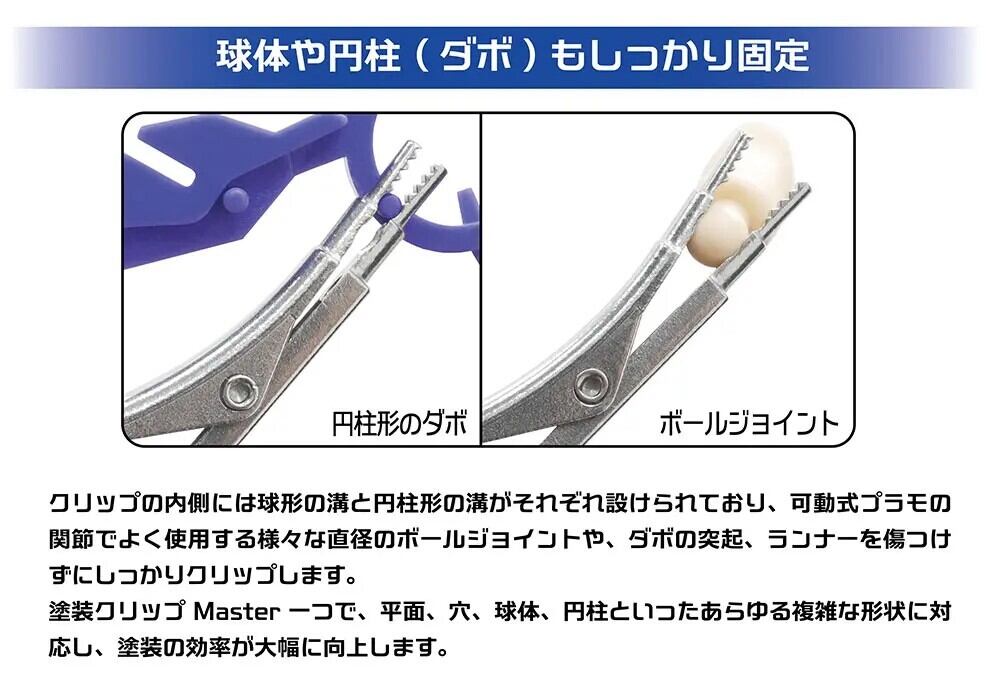 クリップの内側には球形の溝と円柱形の溝がそれぞれ設けられており、可動式プラモの関節でよく使用する様々な直径のボールジョイントや、ダボの突起、ランナーを傷つけずにしっかりクリップします。塗装クリップMaster一つで、平面、穴、球体、円柱といったあらゆる複雑な形状に対応し、塗装の効率が大幅に向上します。