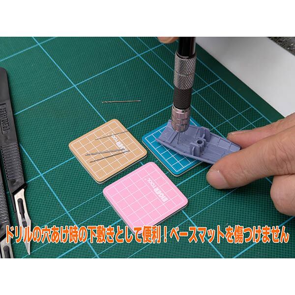ピンバイスで穴あけ工作する際、ピンポイントで下敷きにつかえ、ベースのカッターマットや作業机を保護します。