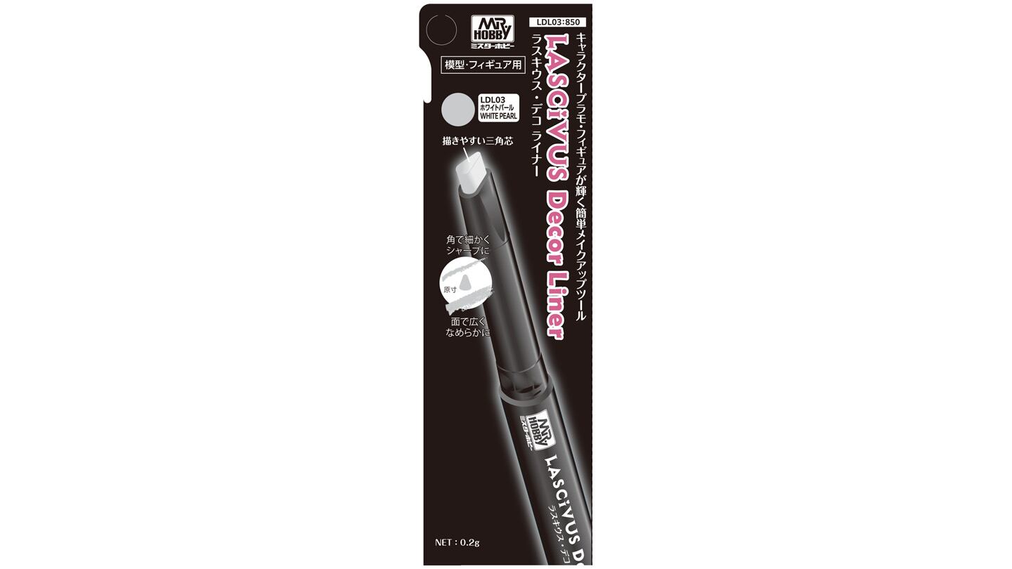 塗ってぼかすだけのキャラクタープラモデル・フィギュア用パウダー塗料「ラスキウス・デコ」シリーズに、より手軽に、よりピンポイントに使えるライナータイプが登場します。三角形の芯を採用することにより、塗布面積のコントロールをしやすい設計としております。チークやハイライトなど、細部の表現に便利なカラー3色の展開です。