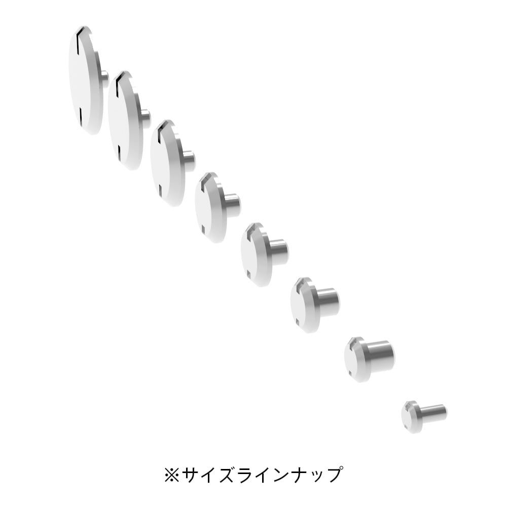 真上から見た時の形が、H字形状(H-Shape)。ミサイルのハッチや弾頭、関節円形部の置き換えなどに出番が多い形状です。真鍮製ニッケルメッキ済。取り付けたい場所に足径と同じサイズの穴を開けて接着します。塗装後でも接着でき、取り付け穴を隠してくれるので、細かな塗り分けも簡単に行えます。