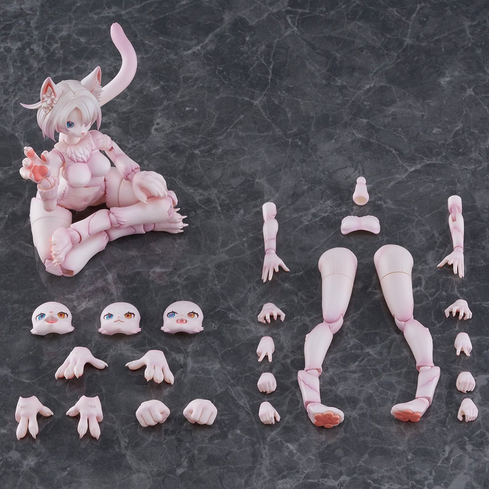 『けもプラ』は、自分好みのケモノを作れるカスタマイズプラモデルです。ケモノ要素・ヒト要素の割合を示すケモ度や、ケモノの種類などが、パーツ組み換えによって自由に調整できます。人とは違ったケモノならではのこだわりシルエットと、自分の理想を再現できる多種多様な組み合わせ方で、あなただけのオリジナルの世界観をお楽しみいただけます。カオマニーはタイ原産の猫で、「白い宝石」とも呼ばれる純白の毛と美しいオッドアイが特徴です。ボディはホワイト一色で成型され、前髪の隙間からのぞく凛々しい瞳は青色と黄色のオッドアイとなっています。